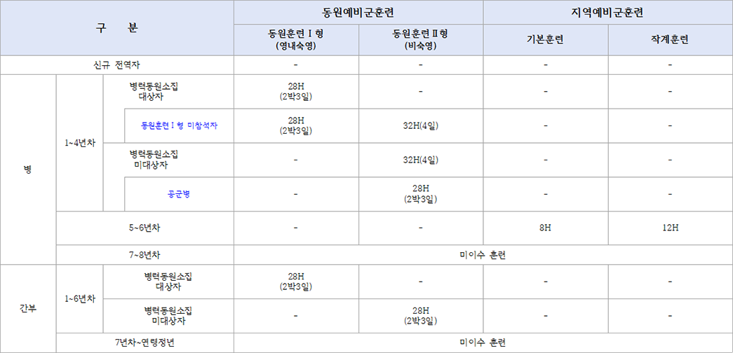 동원훈련Ⅰ형 : 동원훈련장에 입소하여 2박3일간(28시간) 전시상황을 대비하는 훈련